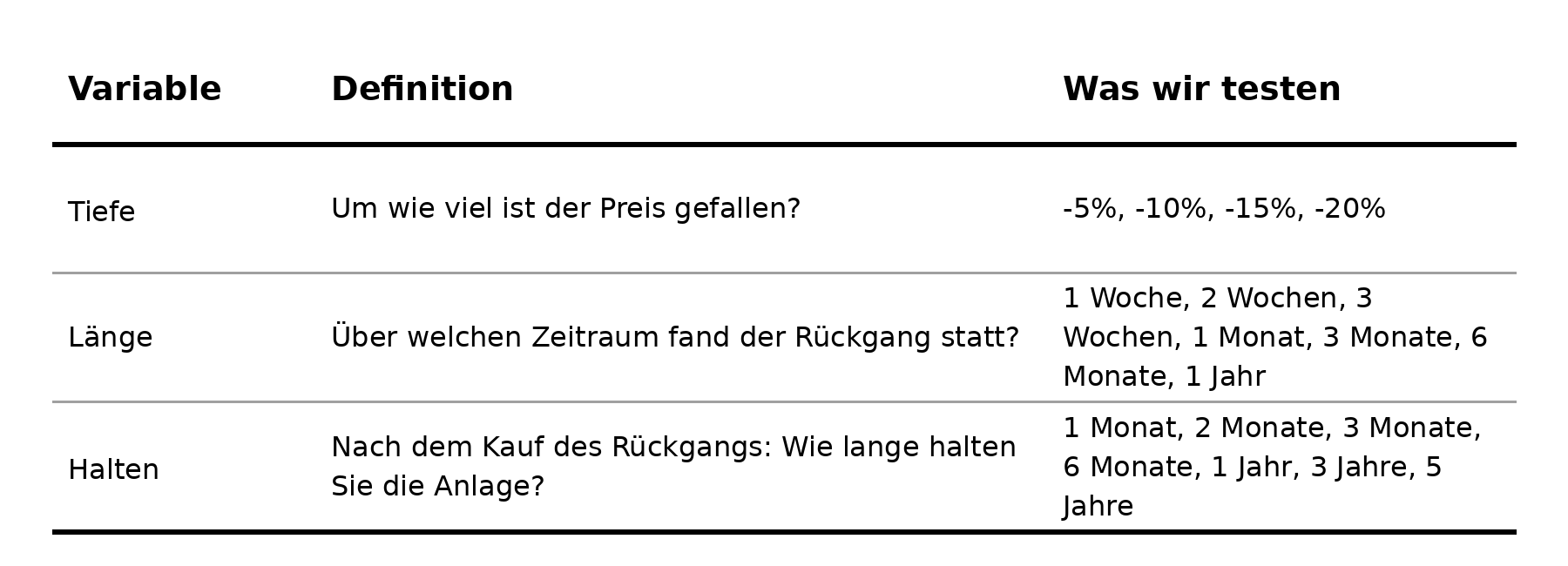 AQR macht aus dem Bauchgefühl einen Baukasten. Drei Parameter werden variiert: die Tiefe des Rückgangs (−5% bis −20%), die Dauer (eine Woche bis ein Jahr) und die Haltedauer nach dem Kauf (ein Monat bis fünf Jahre). Daraus entstehen 196 unterschiedliche Regeln.