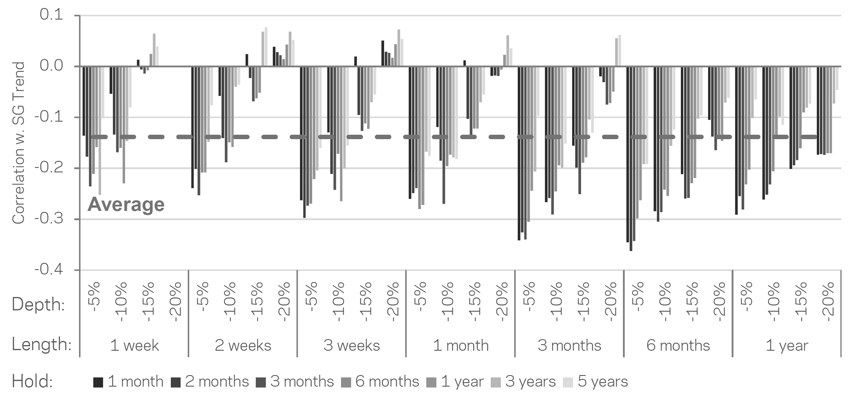 AQR turns the gut feeling into a toolkit. Three parameters are varied: the depth of the decline (–5% to –20%), the length (one week to one year) and the holding period after the purchase (one month to five years). This produces 196 different rules.